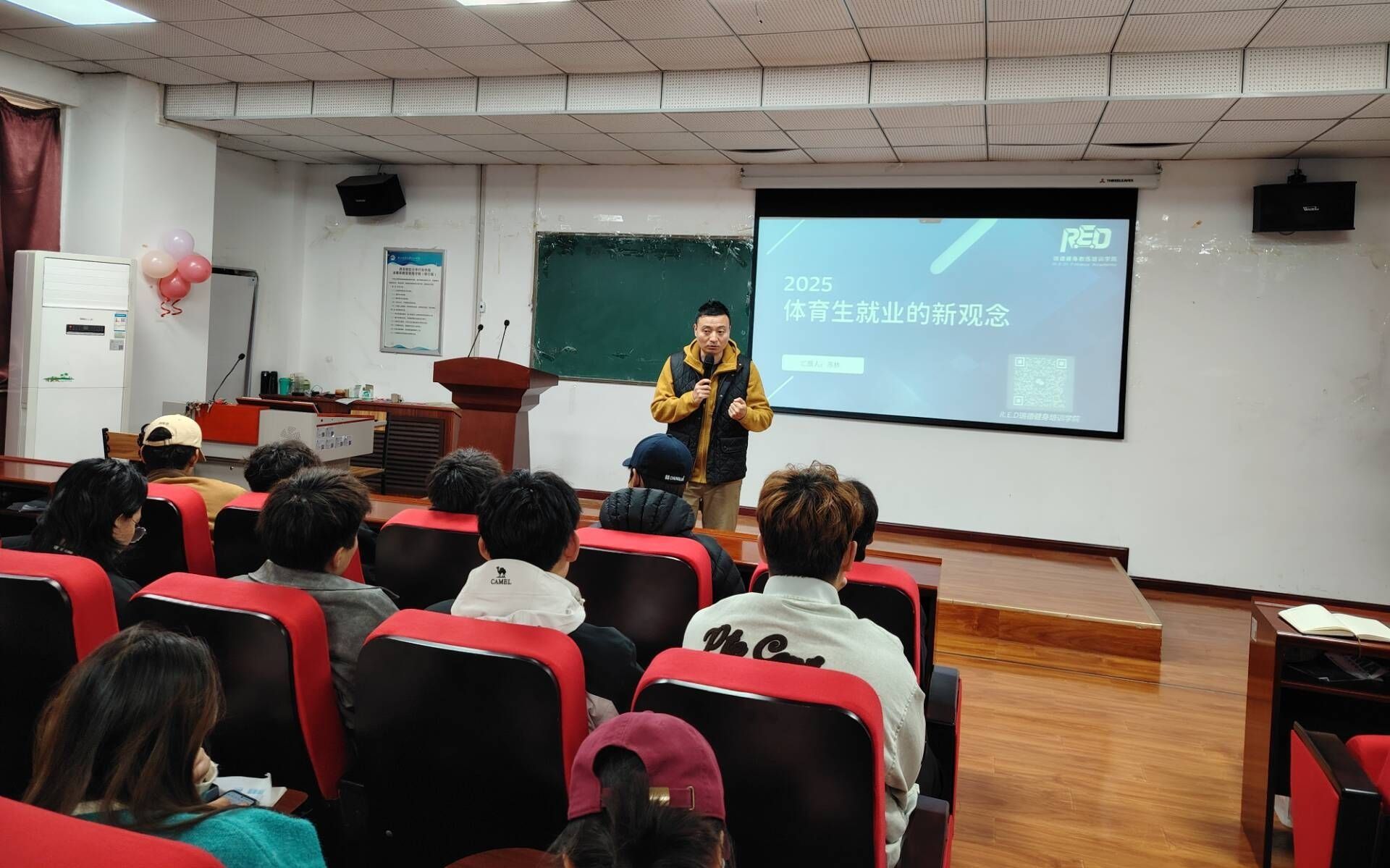 西安瑞德体育健身有限公司总经理苏林受邀担任主讲嘉宾,他以行业前沿视角,结合最新市场数据,深入剖析健身指导领域“精准化、复合型、场景化”三大发展趋势,为在场学子带来满满“就业干货”。苏林指出,当前健身行业细分岗位薪资持续走高,青少儿体适能、产后恢复、中考体育指导等岗位时薪最高可达800元;与此同时,行业对人才能力的要求不断升级,运动评估、数据分析、线上直播等技能已成为健身教练必备的“新六件套”;随着社区健身、企业团课、家庭私教、云端指导等多场景需求同步爆发,行业人才缺口空前扩大。在互动环节,苏林针对同学们关心的“如何快速拿下高含金量证书”“零基础如何打造个人健身 IP”等热点问题,结合实战案例逐一拆解支招,现场掌声与笑声此起彼伏,互动氛围十分热烈。
