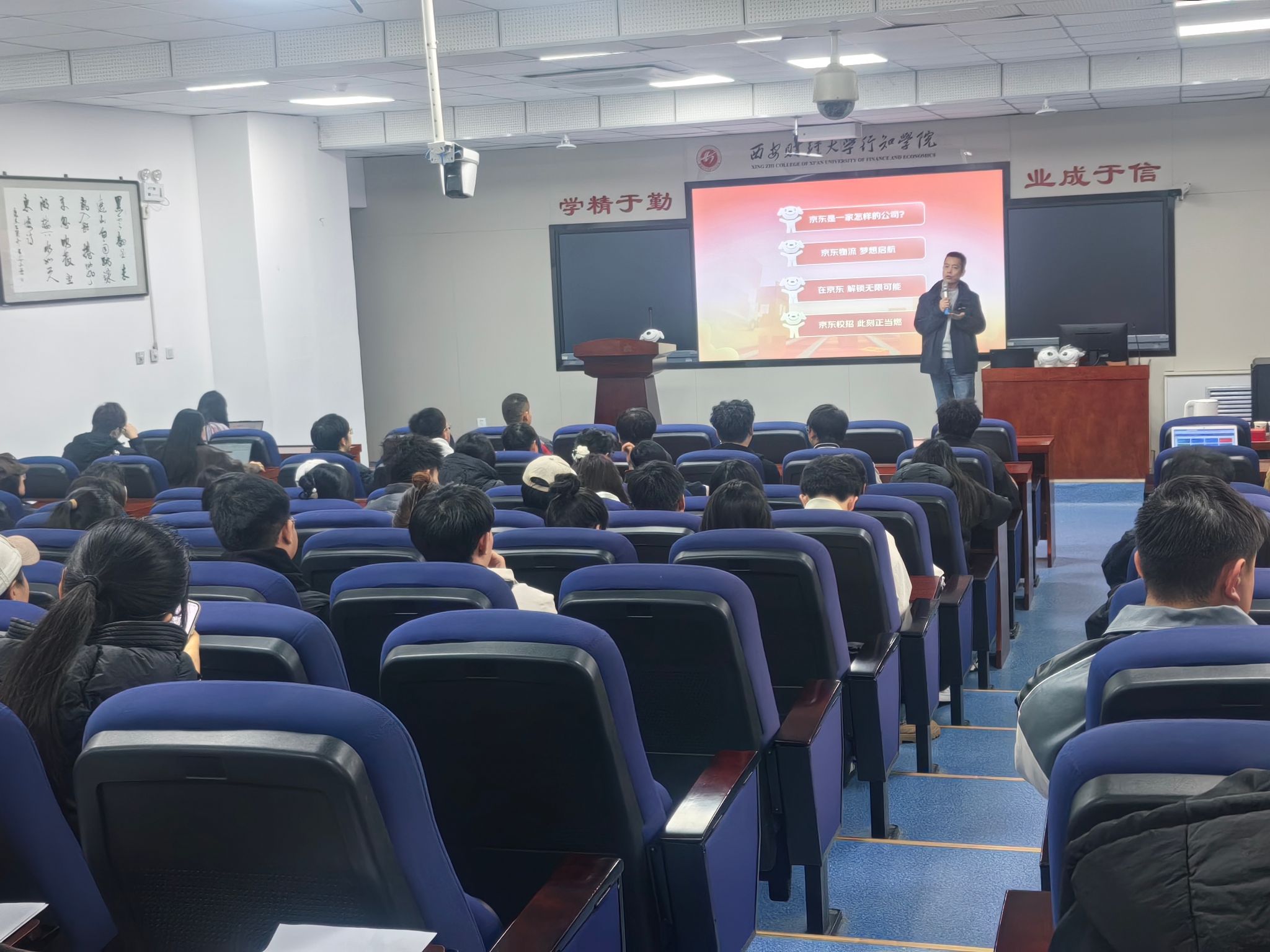 宣讲会上,李强经理以“京东是一家什么样的公司?”为切入点,通过有奖问答的互动形式,在轻松热烈的氛围中分享了京东集团的发展历程与企业文化。结合课件演示,李强进一步介绍了“新锐之星”校招项目的具体岗位,包括经营管理、运营管理、客服管理及商务销售等四大方向,并就学生普遍关注的薪酬福利、培养机制与职业发展路径作了细致解读。