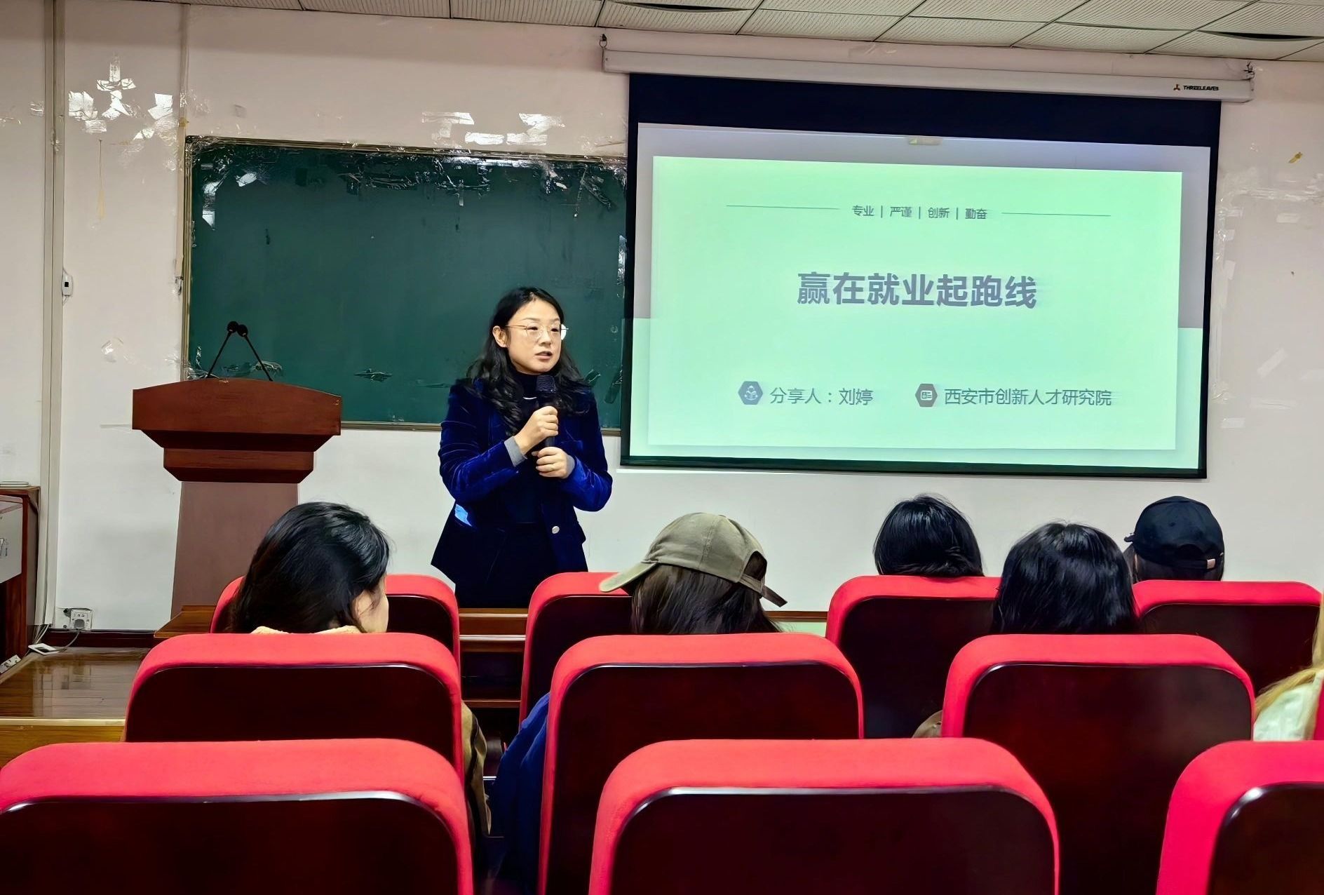 讲座中,刘婷首先以就业数据揭示当前就业现状:2025年全国高校毕业生预计达1222万人,人工智能、新能源汽车等领域人才缺口超百万。她结合陕西重点产业链与西安紧缺人才目录,建议学子聚焦高端制造、生物医药等领域精准择业。随后,她围绕“学习—求职—发展”三个维度展开核心分享。学习篇:需重新定义“人才”标准,强调需兼具专业知识、“AI+”跨领域技能与“三观正、执行力强”的职业素养;求职篇:提出“看市场、看企业、看岗位”策略,指导学子用第三方平台核查企业资质、解读劳动合同法规避风险,并警惕“焦虑海投”等心态陷阱;发展篇:则重在勾勒职业成长路径,建议入职1年夯实基础、5年成专业人士、15年向管理岗进阶,鼓励通过跨界学习、提升文笔持续成长。